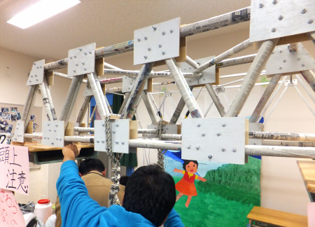 トラス橋の模型。梁(はり)部分はすべて新聞紙ですが、橋自体は人が乗っても耐えられる強度を有しています。
