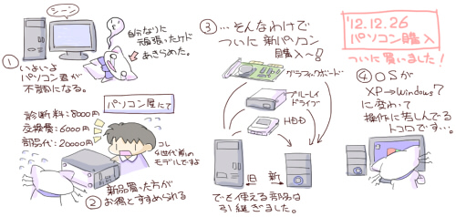 ついにパソコン購入しちゃいましたっ!! 今までWindowsXPでしたので、Windows7の操作方法に戸惑っています…。 まず”マイコンピュータ”がどこにあるのか分からずに苦戦。 今現在は、フォルダを開いて、1つ上の階層に行く場合がよく分かりません(泣 少しずつ慣れて行きたいと思います。