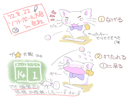 突然ソフトボール大会に誘われて出場してきました。 ・・・よっぽどヒマしてそうに思われたのかな? 結果は、えっと・・・お、惜しくも・・・大敗(T△T) あーーーーっうーーっ。 遊びで負ける時ほど、悔しいことって無いと思います。 遊びは真剣ですよっ!! 勉強とか仕事は・・・ゴニョゴニョ・・・。